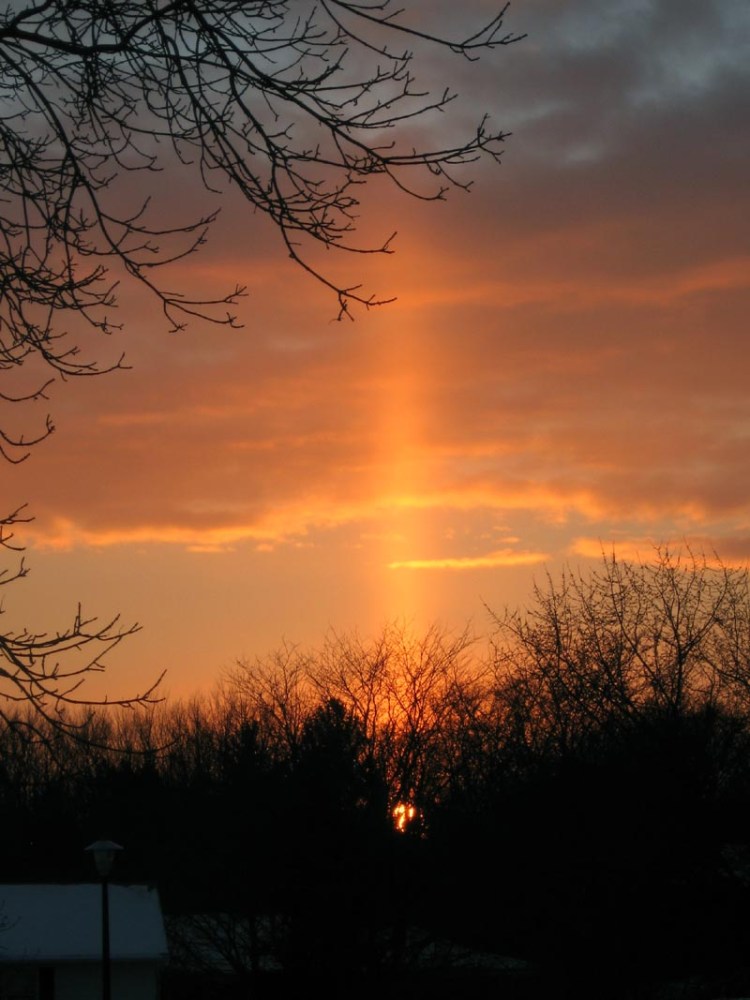 * UPDATE: I Googled your term, “solar pillar,” and now I feel like an idiot for never having known about them! Seriously, must come from living so long in the South. And despite the first few hits insisting these things are “rare,” I sure found a plethora of photos in the Image Search. But at least I got to see my own, so I’m happy to add my photo to the list. 🙂