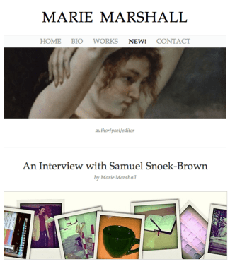 This time, it was to the excellent Marie Marshall, who interviewed me for her blog. “The difficulty with interviewing writer and teacher-of-writing Samuel Snoek-Brown,” she writes in the introduction, “is that his web site is so comprehensive that there is little left to ask. I’m reduced to quizzing him about the names of his cats.”