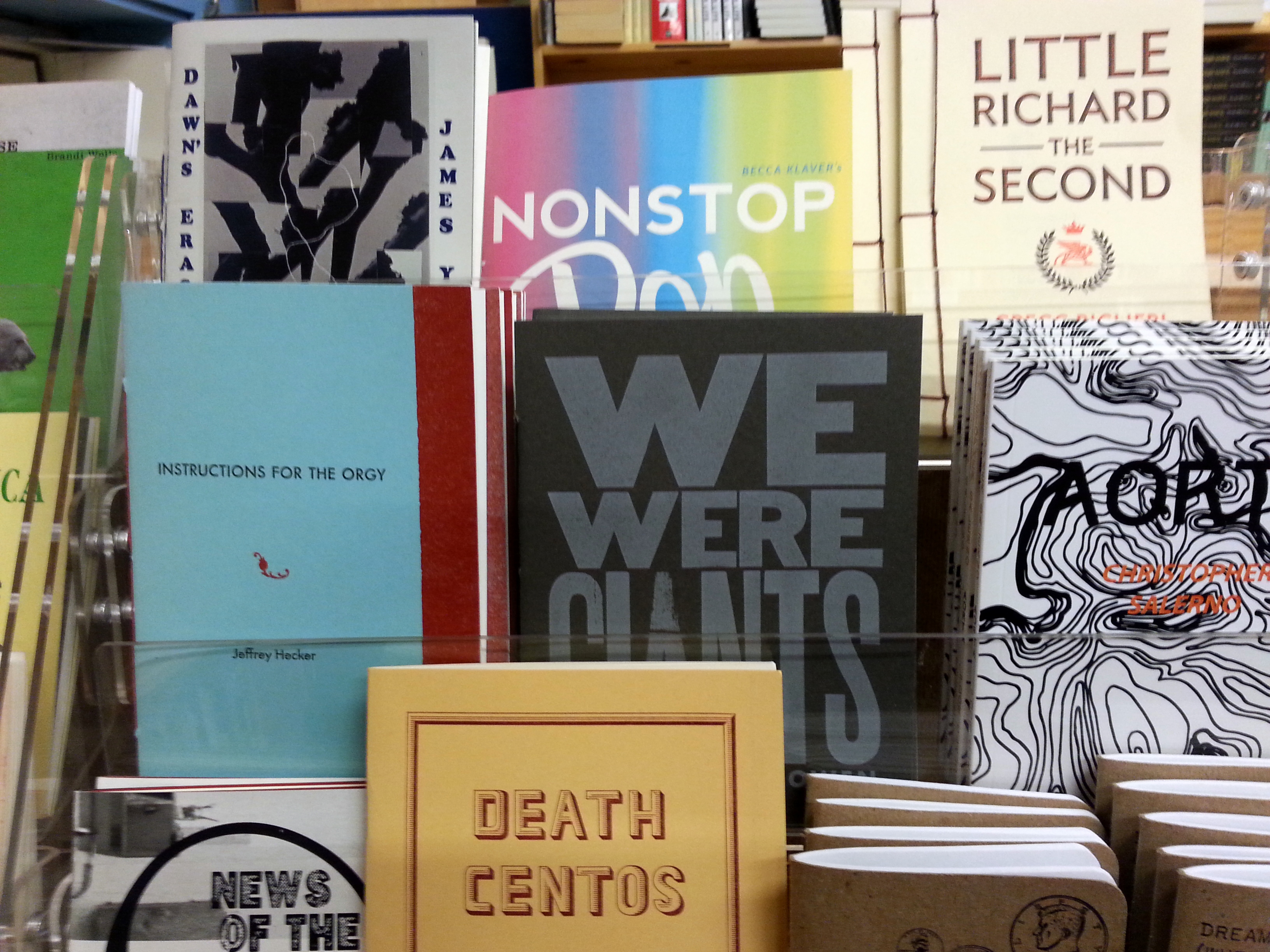 And a little ways down the shelf, I also found my sunnyoutside press-mates Jeffrey Hecker (Instructions for the Orgy) and Christopher Bowen (We Were Giants), whose books I got in the mail earlier this past week.