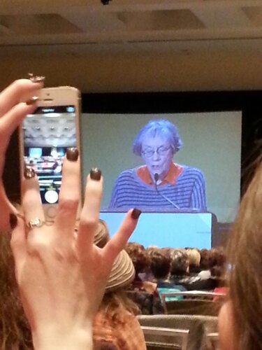 I didn’t bring any of her books with me (I’m lugging home enough from the bookfair without bringing my own), so I skipped the VERY long autograph line, but I did stop to charge my phone and draft this post. By the time I’d nearly finished this, the line was gone, but I realized Proulx was still at the table, gathering her things. I walked over to thank her for making the time to speak at our conference; I told her how much I loved her address tonight and that I think her writing is amazing.