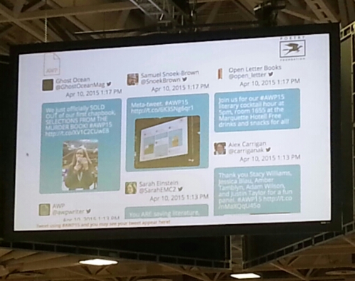 On Twitter, I’ve been trying to tweet bookfair tables I’ve been to as a way to plug them and direct more traffic their way. Today, for a little meta-on-meta fun, I tweeted a photo of the big AWP Twitter jumbotron in the bookfair, and then I took a photo of my tweet on said jumbotron: