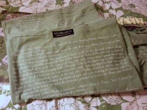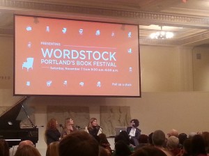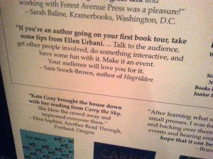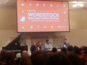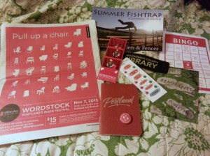 I kept wanting to take photos of all the amazing booths and displays, which included not only books for sale and writing groups and conferences to plug, but also games and swag and opportunities to play with words (I especially loved a cut-out paper “magnet poetry” board with which to compose your six-word memoir), but my phone’s camera doesn’t do well in dim light and the bookfair was CROWDED, so I only managed to snap one photo of a very cool display at the